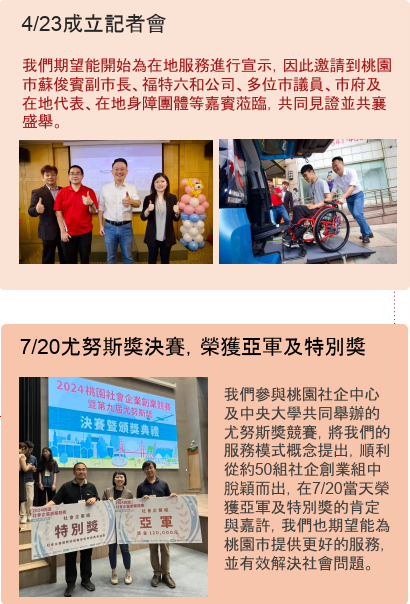 因此,我們提供無障礙交通服務與爬梯機設備,並為想要重返職場的畢業照顧者,提供專屬的專業培訓,為行動不便者提供移動的服務,滿足需求。我們期望這樣的方式,可以讓行動不便者外出需求獲得滿足,並為照顧者創造發揮所長的就業機會,同時解決兩個社會問題。