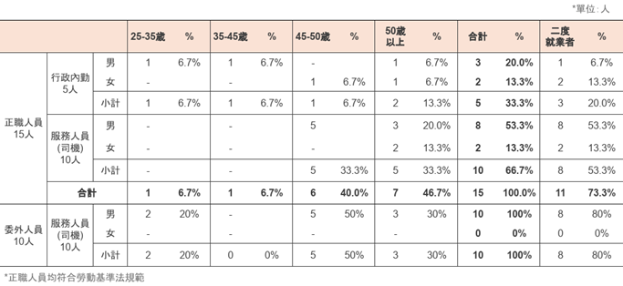 本公司將保護不同性別勞工的權益,為所有職員與司機創造安全和有保障的工作環境,並且實現全面年齡就業制度,使畢業生或二度就業生都能獲得合宜工作,包括青年與身心障礙者,並具同工同酬的公平待遇。