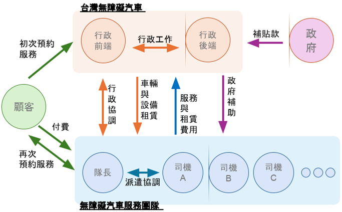 台灣無障礙汽車公司由行政團隊組成,對初次服務使者進行服務接洽,並分派給對應地區的服務團隊服務。之後顧客可需求與團隊自行聯繫,增進服務提供效益。