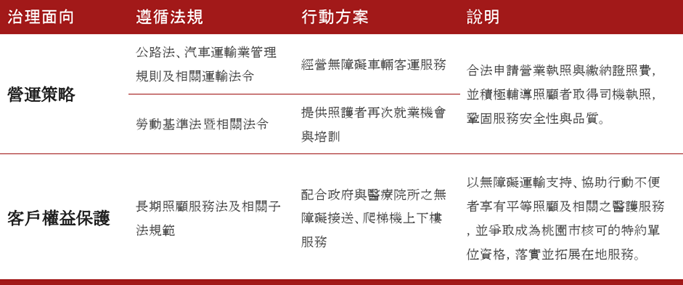 期望透過完善的公司治理機制,建立一個透明、公平且具社會責任的管理體系。未來,我們將不斷提升公司的環境、社會與治理(ESG)表現,確保在發展無障礙運輸的同時,也能實現永續經營與社會價值的最大化。此外,我們也致力於成為業界標竿,推動創新並建立更多公私協力的合作關係,帶動產業進步與社會發展,最終達成兼顧利益與公益的雙贏局面。